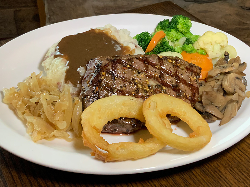 10oz certified Angus@ New York Striploin char-grilled and served with potato and vegetables